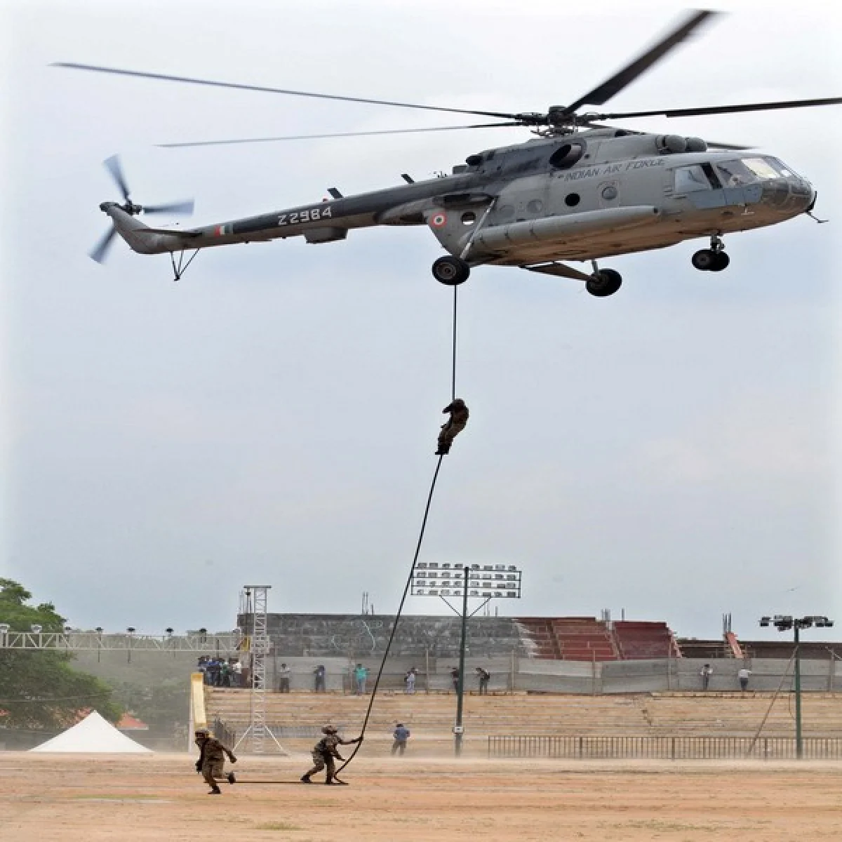 ವಾಯುಸೇನೆಯ 9 ಯೋಧರು ಸ್ಲಿತರಿಂಗ್ ಎಂಬ ಕಾರ್ಯಾಚರಣೆ ಪ್ರದರ್ಶಿಸಿದರು. ಎತ್ತರದಲ್ಲಿ ಹಾರುತ್ತಿದ್ದ ಹೆಲಿಕಾಪ್ಟರ್ನಿಂದ ನುಣುಪಾದ ಹಗ್ಗ ಕೆಳಗೆ ಬಿಟ್ಟು ಯೋಧರು ಜಾರಿಕೊಂಡು ತಮ್ಮ ಸನ್ನದ್ಧ ಸ್ಥಿತಿಯನ್ನು ಪ್ರದರ್ಶಿಸಿದರು. ವಾಯುಪಡೆಯ ಯೋಧರು ಪೆಟಲ್ ಡ್ರಾಪಿಂಗ್ ಮತ್ತು ಸ್ಕೈ ಡೈವಿಂಗ್ ಪ್ರದರ್ಶನ ನಾಳೆ ನಡೆಯುವ ಕಾರ್ಯಕ್ರಮದಲ್ಲಿ ನೀಡಲಿದ್ದಾರೆ.