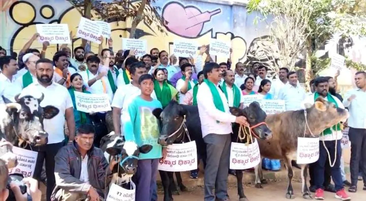 ಬೆಂಗಳೂರು : ಬಿಜೆಪಿ ಪ್ರತಿಭಟನೆಗೆ ಹಸು ಮತ್ತು ಕರುಗಳನ್ನು ಕರೆತಂದಿರುವುದನ್ನು ಆಕ್ಷೇಪಿಸಿದ ಪ್ರಾಣಿಪ್ರಿಯರು ಈ ಬಗ್ಗೆ ಬಿಜೆಪಿ ಕಾರ್ಯಕರ್ತರೊಂದಿಗೆ ವಾಗ್ವಾದ ನಡೆಸಿದ್ದಾರೆ. ಪಶುಪಾಲಕರು ಮತ್ತು ರೈತರಿಗೆ ಸಹಾಯಧನ ನೀಡಬೇಕೆಂದು ಒತ್ತಾಯಿಸಿ ಕಾಂಗ್ರೆಸ್ ವಿರುದ್ದ ಬಿಜೆಪಿ ನಡೆಸುತ್ತಿದ್ದ ಪ್ರತಿಭಟನೆಯ ವಿರುದ್ದ ಮತ್ತೊಂದು ಪ್ರತಿಭಟನೆ ನಡೆಸಿರುವ ವಿಚಿತ್ರ ಸಂಗತಿ ಮಂಗಳವಾರ ಫ್ರೀಡಂ ಪಾರ್ಕ್ ನಲ್ಲಿ ನಡೆದಿದೆ.