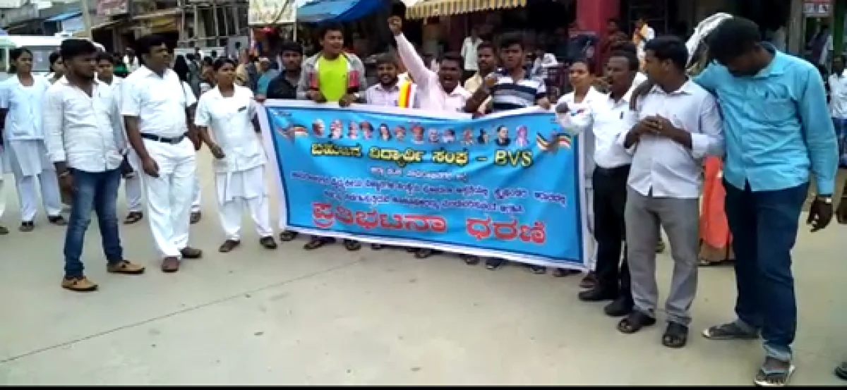 ವೈದ್ಯಕೀಯ ಕಾಲೇಜಿನ ಬೋಧನಾ ಆಸ್ಪತ್ರೆಯಲ್ಲಿ ಸ್ಟೆಪಂಡರಿ ಆಧಾರದಲ್ಲಿ ಕರ್ತವ್ಯ ನಿರ್ವಹಿಸುತ್ತಿರುವ ನರ್ಸ್ ಗಳನ್ನು ಮುಂದುವರಿಸುವಂತೆ ಆಗ್ರಹಿಸಿ ಬಿವಿಎಸ್ ಸಂಘಟನೆ ನೇತೃತ್ವದಲ್ಲಿ ಚಾಮರಾಜನಗರದಲ್ಲಿ ಪ್ರತಿಭಟನೆ ನಡೆಯಿತು.
