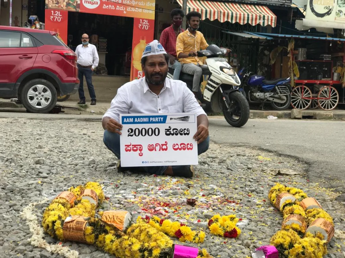ನಗರದಲ್ಲಿ ಮತ್ತೆ ಕಳಪೆ ಗುಂಡಿಗಳ ವಿರುದ್ಧ ಆಮ್ ಆದ್ಮಿ ಕಾರ್ಯಕರ್ತರು ಸಿಡಿದೆದ್ದಿದ್ದಾರೆ.ನಿನ್ನೆ ಹಲಸೂರಿನಲ್ಲಿ ಆಮ್ ಆದ್ಮಿ ಪಕ್ಷದ ಕಾರ್ಯಕರ್ತರಿಂದ ಗುಂಡಿಬಿದ್ದ ಜಾಗದಲ್ಲಿ ಪೂಜೆ ಮಾಡಲಾಗಿದೆ.