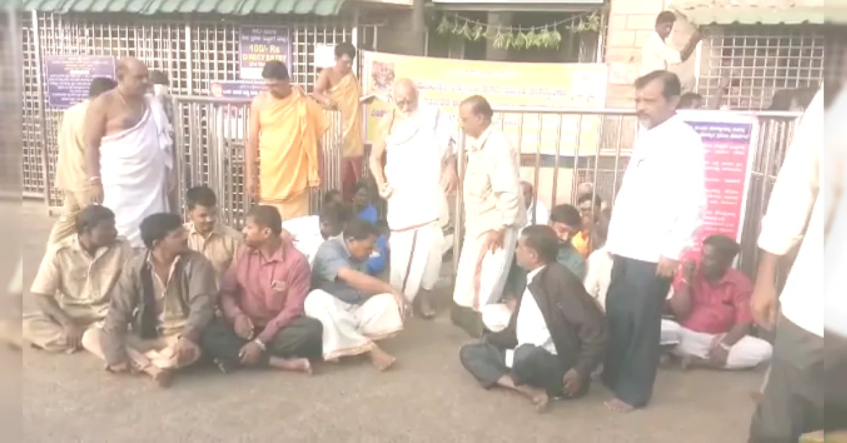 ಬೆಳ್ಳಂಬೆಳಿಗ್ಗೆ ದೇವಾಲಯದ ಮುಂದೆ ಪ್ರತಿಭಟನೆಗೆ ಪುರೋಹಿತರು, ಅರ್ಚಕರು ಹಾಗೂ ಸಿಬ್ಬಂದಿ ಕುಳಿತರು. ನಿನ್ನೆ ಡಿಸಿ ನೇತೃತ್ವದ ಅರ್ಚಕರ ಸಂಧಾನ ಸಭೆ ವಿಫಲವಾದ ಹಿನ್ನೆಲೆಯಲ್ಲಿ ಧರಣಿ ನಡೆಸಲಾಯಿತು.