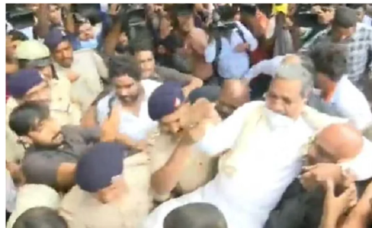 ರಾಜ್ಯದ ಕಾಂಗ್ರೆಸ್ ನಾಯಕರು ಗುರುವಾರ ರಾಜಭವನ ಚಲೋ ಪ್ರತಿಭಟನಾ ರ್ಯಾಲಿ ಮೂಲಕ ಮುತ್ತಿಗೆ ಹಾಕಲು ಯತ್ನಿಸಿದಾಗ ವಿಪಕ್ಷ ನಾಯಕ ಸಿದ್ದರಾಮಯ್ಯ, ಕೆಪಿಸಿಸಿ ಅಧ್ಯಕ್ಷ ಡಿ.ಕೆ.ಶಿವಕುಮಾರ್ ಸೇರಿ ಹಲವರನ್ನು ಪೊಲೀಸರು ವಶಕ್ಕೆ ಪಡೆದಿದ್ದಾರೆ.