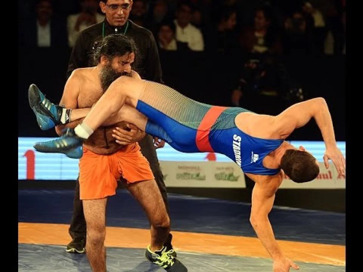 ಬಾಬಾ ದಂಗಲ್: ಒಲಿಂಪಿಕ್ ವಿಜೇತನಿಗೆ ಮಣ್ಣು ಮುಕ್ಕಿಸಿದ ರಾಮದೇವ್ (ವಿಡಿಯೋ)